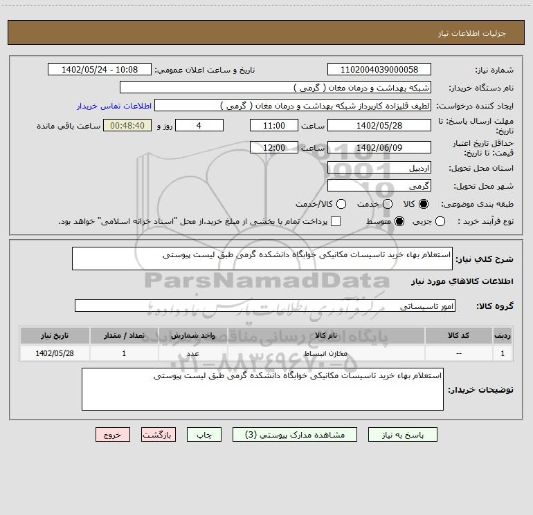 شرح کلی نیاز: استعلام بهاء خرید تاسیسات مکانیکی خوابگاه دانشکده گرمی طبق لیست پیوستی