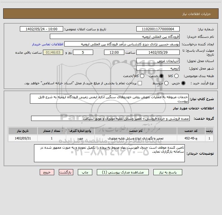 شرح کلی نیاز: خدمات مربوطه به عملیات تعویض روغن خودروهای سنگین اداره ایمنی زمینی فرودگاه ارومیه به شرح فایل پیوست