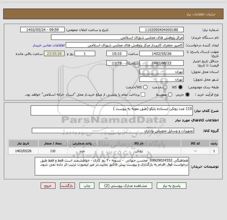 شرح کلی نیاز: 110 عدد زونکن ایستاده پاپکو (طبق نمونه به پیوست )