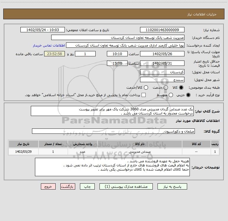 شرح کلی نیاز: یک عدد صندلی گردان مدیریتی مدل 3060 شرکت پاک مهر برابر تصوبر پیوست