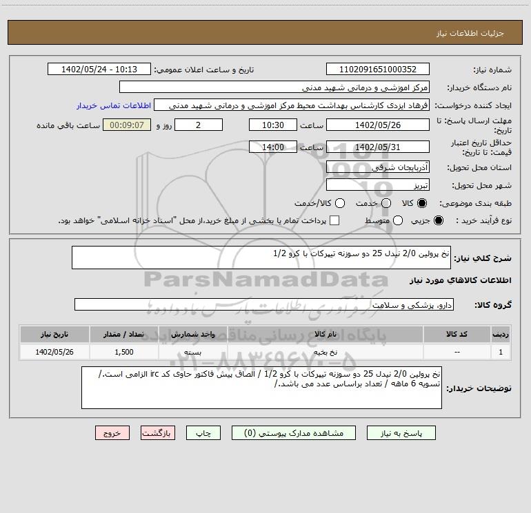 شرح کلی نیاز: نخ پرولین 2/0 نیدل 25 دو سوزنه تیپرکات با کرو 1/2