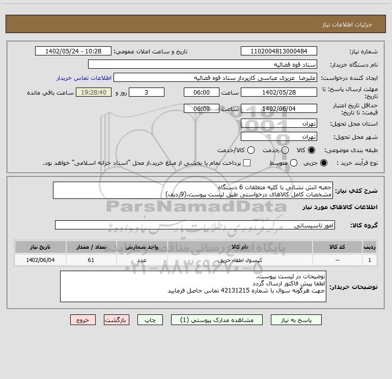شرح کلی نیاز: جعبه اتش نشانی با کلیه متعلقات 6 دستگاه