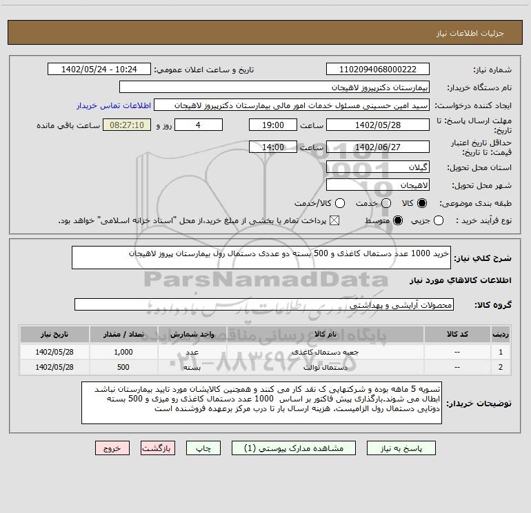شرح کلی نیاز: خرید 1000 عدد دستمال کاغذی و 500 بسته دو عددی دستمال رول بیمارستان پیروز لاهیجان