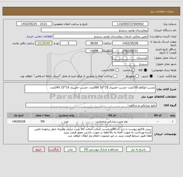 | 1 | -- | نوار چسب پزشکی یا جراحی | عدد | 700 | 1402/05/28 |