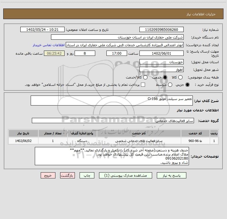 شرح کلی نیاز: تعمیر سر سیلندر موتور Ci-166