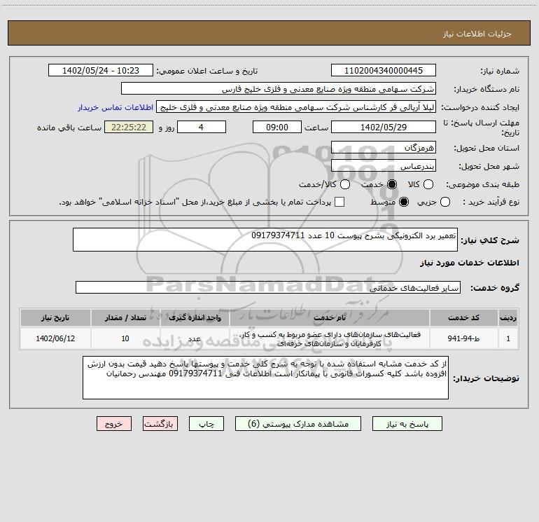 شرح کلی نیاز: تعمیر برد الکترونیکی بشرح پیوست 10 عدد 09179374711