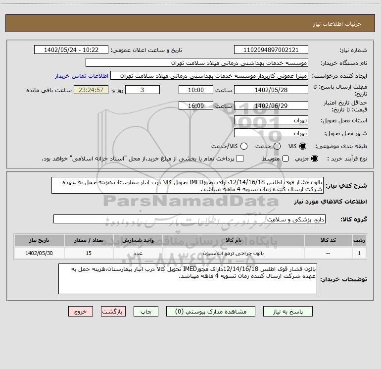 نام دستگاه خریدار:موسسه خدمات بهداشتی درمانی میلاد سلامت تهران