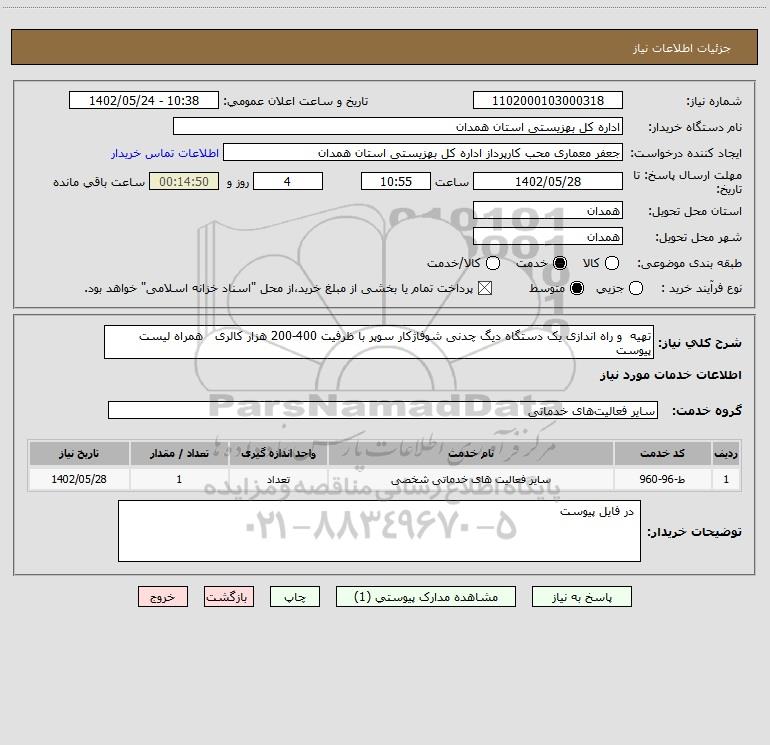 استعلام بها و موضوع استعلام استعلام تهیه و راه اندازی یک دستگاه دیگ چدنی شوفاژکار سوپر با ظرفیت 400-200 هزار کالری همراه لیست پیوست به اطلاع کلیه شرکتها و افراد متخصص واجد شرایط میرساند، آگهی گذار در نظر دارد از طریق استعلام بها، نسبت به انتخاب و دریافت پیشنهادات اقدام نماید. این استعلام با کد آگهی ثبت شده در سامانه خبرگزاری پارس نماد : 6223474 منتشر شده است. مشخصات استعلام : تاریخ شروع استعلام: 1402/05/24 آخرین مهلت ارسال پیشنهاد قیمت : 1402/05/28 و محل اجرای پروژه : استان همدان میباشد. استعلام قیمت مورد درخواست : استعلام تهیه و راه اندازی یک دستگاه دیگ چدنی شوفاژکار سوپر با ظرفیت 400-200 هزار کالری همراه لیست پیوست با دستهبندیهای تخصصی و گروه های مرتبط : تاسیسات ساختمانی, صنایع حرارتی و برودتی, دیگ بخار, قطعات چدنی و فولادی, استعلام اطلاع رسانی میگردد.
