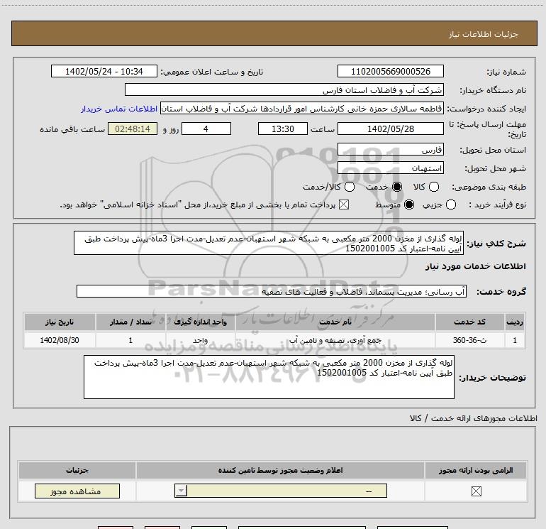 شرح کلی نیاز: لوله گذاری از مخزن 2000 متر مکعبی به شبکه شهر استهبان-عدم تعدیل-مدت اجرا 3ماه-پیش پرداخت طبق آیین نامه-اعتبار کد 1502001005