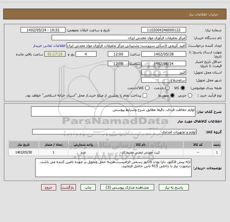 شرح کلی نیاز: لوازم حفاظت فردی. دقیقا مطابق شرح وشرایط پیوستی