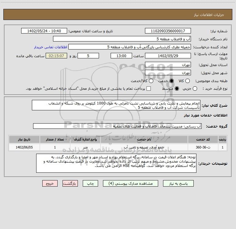 شرح کلی نیاز: انجام پیمایش و نشت یابی و شناسایی نشت نامرئی به طول 1000 کیلومتر بر روی شبکه و انشعاب تأسیسات شرکت آب و فاضلاب منطقه 5