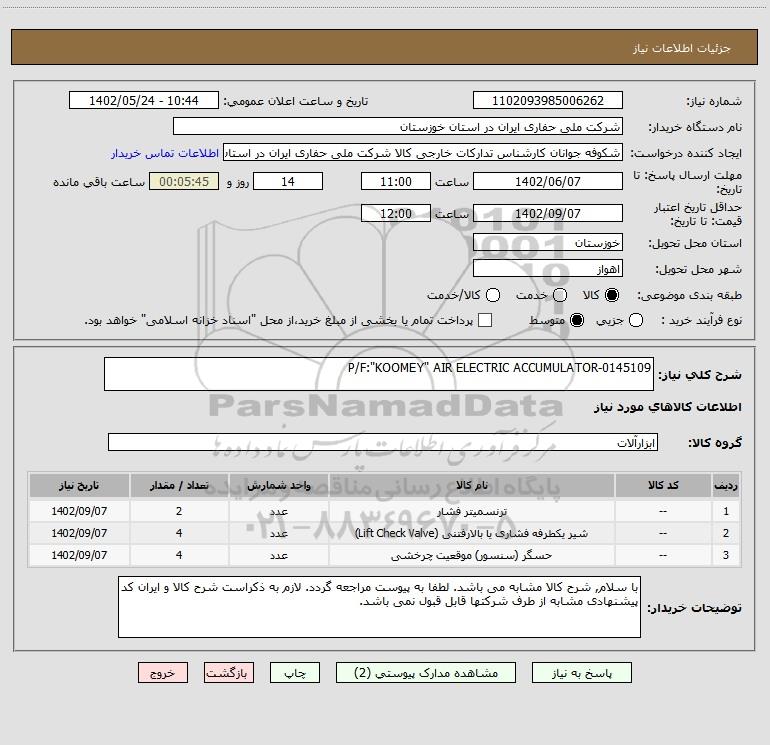 شرح کلی نیاز: P/F:"KOOMEY" AIR ELECTRIC ACCUMULATOR-0145109