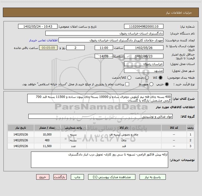 شرح کلی نیاز: 400 بسته چای فله نیم کیلویی دوغزال ساده و 10000 بسته چای نپتون ساده و 11500 بسته قند 700 گرمی مشمش، بارگاه یا گلستان