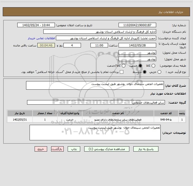 شرح کلی نیاز: تعمیرات انجمن سینمای جوان بوشهر طبق لیست پیوست