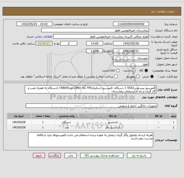 شرح کلی نیاز: گمپرسور پیستونی5532 1 دستگاه--کمپرسور اسکرولZR61 KC-TFD(کولر48000) 1دستگاه به همراه نصب و گاز گیری و راه اندازیدرمحل بیمارستان