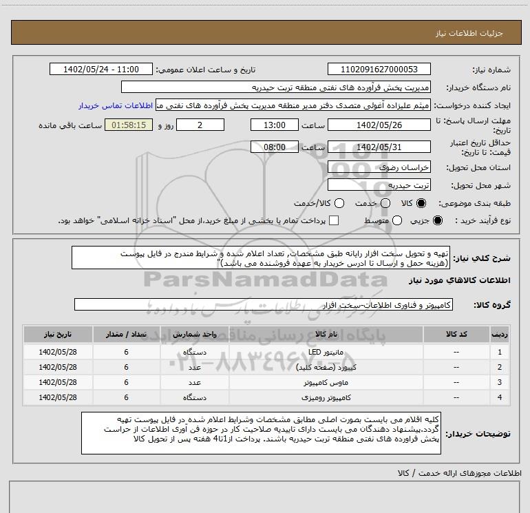 توضیحات خریدار:کلیه اقلام می بایست بصورت اصلی مطابق مشخصات وشرایط اعلام شده در فایل پیوست تهیه گردد.پیشنهاد دهندگان می بایست دارای تاییدیه صلاحیت کار در حوزه فن آوری اطلاعات از حراست پخش فراورده های نفتی منطقه تربت حیدریه باشند. پرداخت از1تا4 هفته پس از تحویل کالا