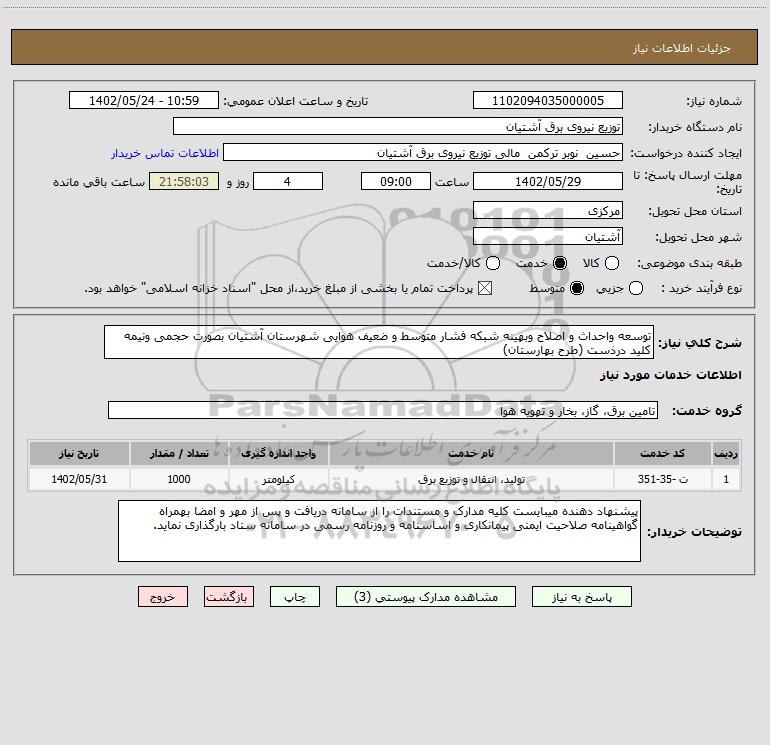 شرح کلی نیاز: توسعه واحداث و اصلاح وبهینه شبکه فشار متوسط و ضعیف هوایی شهرستان آشتیان بصورت حجمی ونیمه کلید درذست (طرح بهارستان)