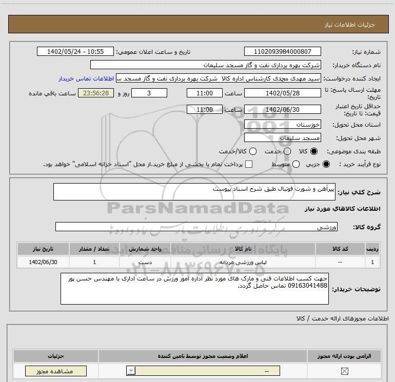 شرح کلی نیاز: پیرآهن و شورت فوتبال طبق شرح اسناد پیوست