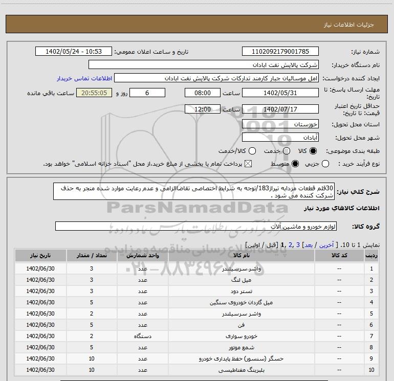 شرح کلی نیاز: 30قلم قطعات مزدابه تیراژ183/توجه به شرایط اختصاصی تقاضاالزامی و عدم رعایت موارد شده منجر به حذف شرکت کننده می شود .