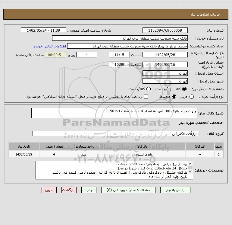 شرح کلی نیاز: جهت خرید باتری 100 آمپر به تعداد 4 عدد شعبه 1501912