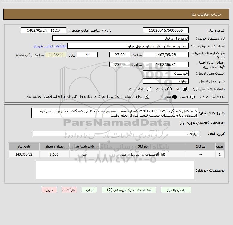 شرح کلی نیاز: خرید کابل خودنگهدار25+25+70+70*3فشار ضعیف آلومینیوم 6سیمه-تامین کنندگان محترم بر اساس فرم استعلام بها و مستندات پیوست قیمت گذاری انجام دهند.