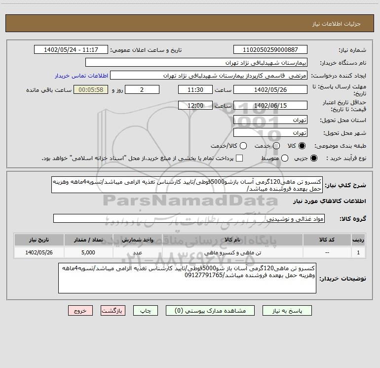 شرح کلی نیاز: کنسرو تن ماهی120گرمی آسان بازشو5000قوطی/تایید کارشناس تغذیه الزامی میباشد/تسویه4ماهه وهزینه حمل بهعده فروشنده میباشد/
