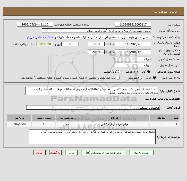 نام دستگاه خریدار:اداره ذخیره سازی غله و خدمات بازرگانی شهر تهران