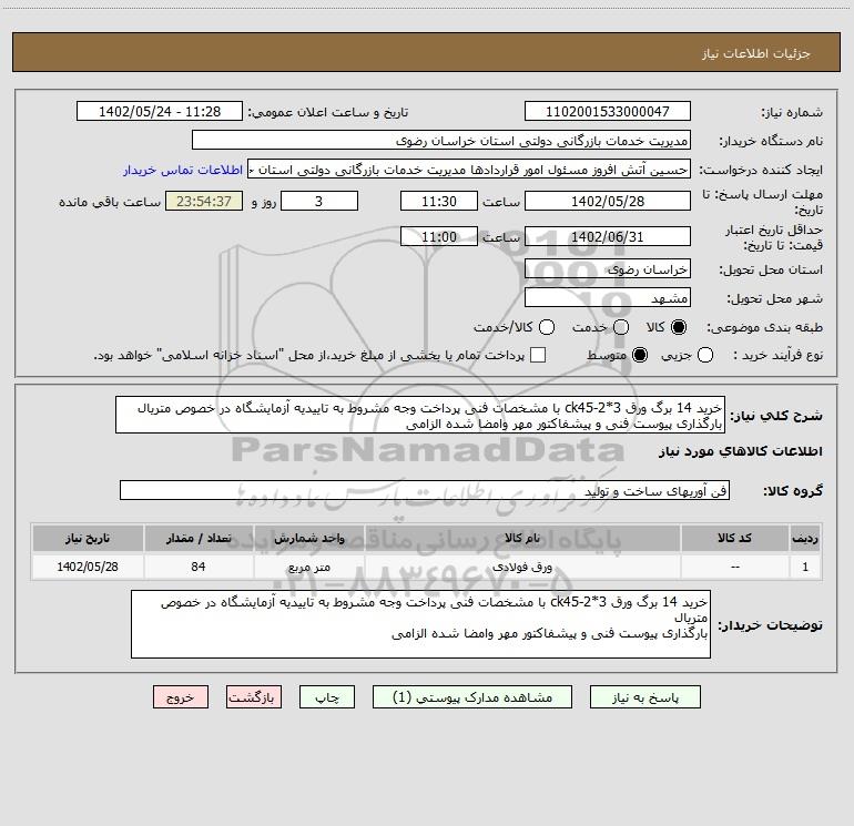 شرح کلی نیاز: خرید 14 برگ ورق ck45-2*3 با مشخصات فنی پرداخت وجه مشروط به تاییدیه آزمایشگاه در خصوص متریال