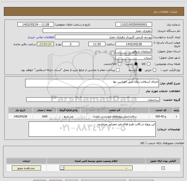 شرح کلی نیاز: اجرای آسفالت ریزی طبق فهرارس بها