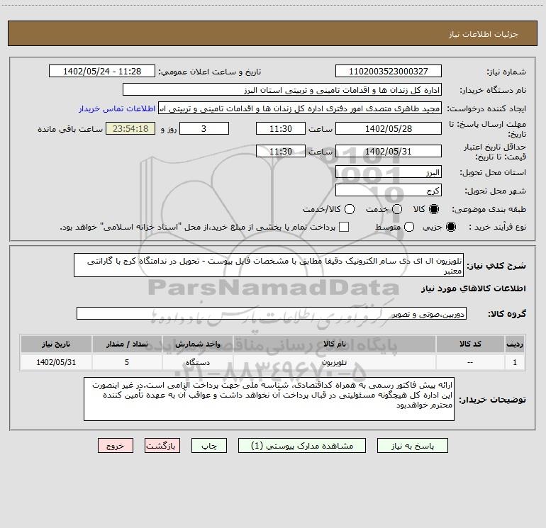 شرح کلی نیاز: تلویزیون ال ای دی سام الکترونیک دقیقا مطابق با مشخصات فایل پیوست - تحویل در ندامتگاه کرج با گارانتی معتبر
