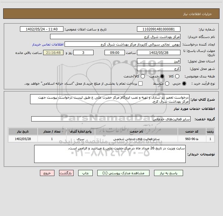 شرح کلی نیاز: درخواست تعمیر زیر سازی و تهیه و نصب ایزوگام مرکز حضرت علی ع طبق لیست درخواست پیوست جهت مرکز بهداشت شرق کرج.