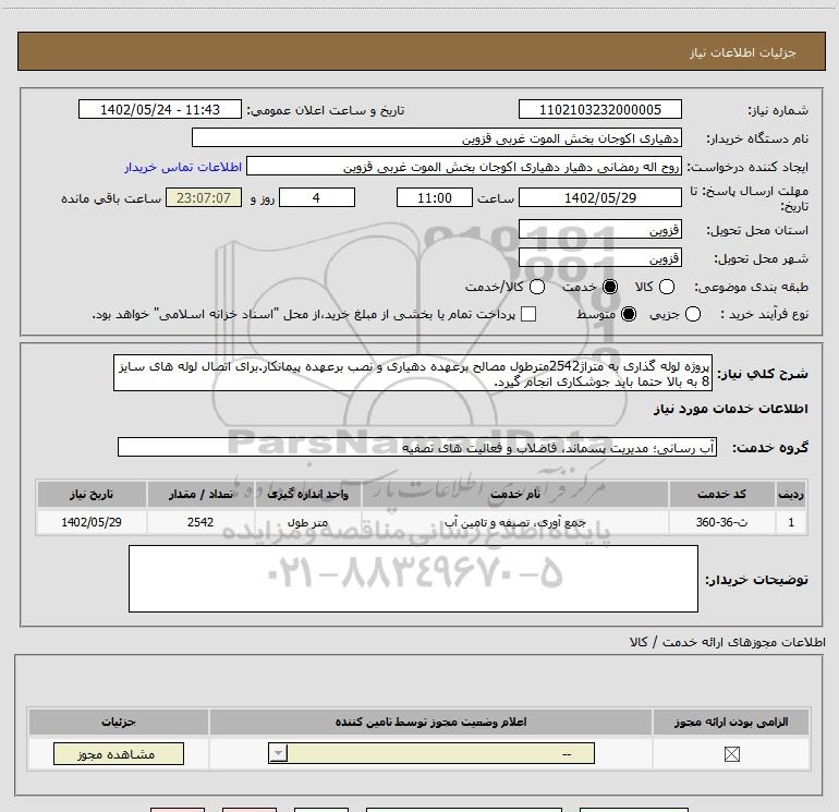 شرح کلی نیاز: پروژه لوله گذاری به متراژ2542مترطول مصالح برعهده دهیاری و نصب برعهده پیمانکار.برای اتصال لوله های سایز 8 به بالا حتما باید جوشکاری انجام گیرد.