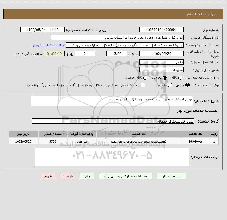 شرح کلی نیاز: برش اسفالت محور سپیدان به شیراز طبق براورد پیوست