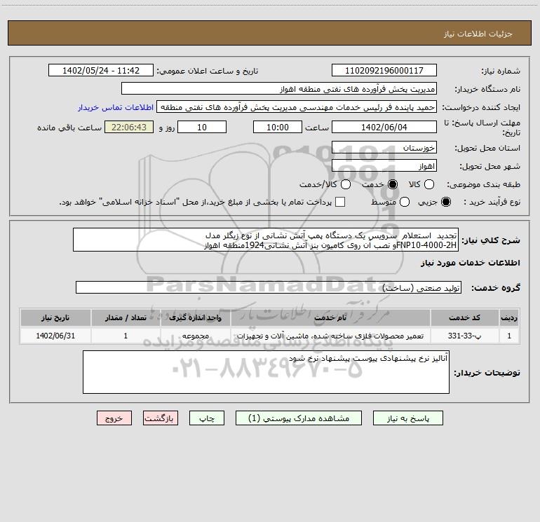 شرح کلی نیاز: تجدید استعلام سرویس یک دستگاه پمپ آتش نشانی از نوع زیگلر مدل