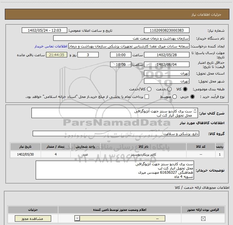 شرح کلی نیاز: ست پری کاردیو سنتز جهت آنژیوگرافی