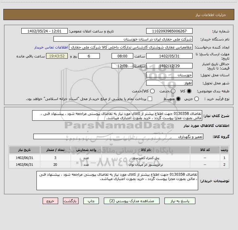 شرح کلی نیاز: تقاضای 0130358 جهت اطلاع بیشتر از کالای مورد نیاز به تقاضای پیوستی مراجعه شود ، پیشنهاد فنی ، مالی بصورت مجزا پیوست گردد ، خرید بصورت اعتباری میباشد.