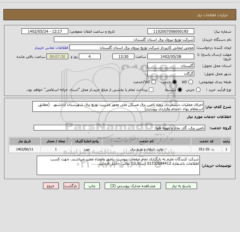 شرح کلی نیاز: اجرای عملیات دستمزدی پروژه تامین برق مسکن ملی ومهر مدیریت توزیع برق شهرستان آزادشهر (مطابق استعلام بهاء ،احجام وقرارداد پیوست)