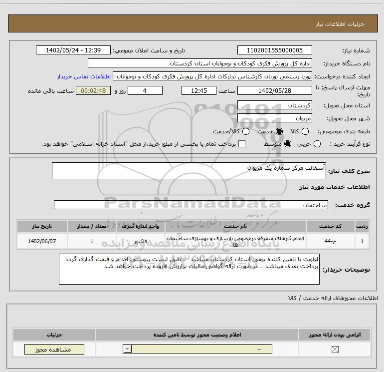 شرح کلی نیاز: آسفالت مرکز شماره یک مریوان