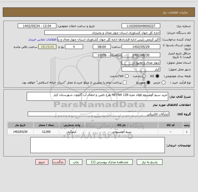 شرح کلی نیاز: خرید سیم آلومینیوم فولاد نمره HEYNA 126 طرح تامین و انتقال آب گاوتوت شهرستان کیار
