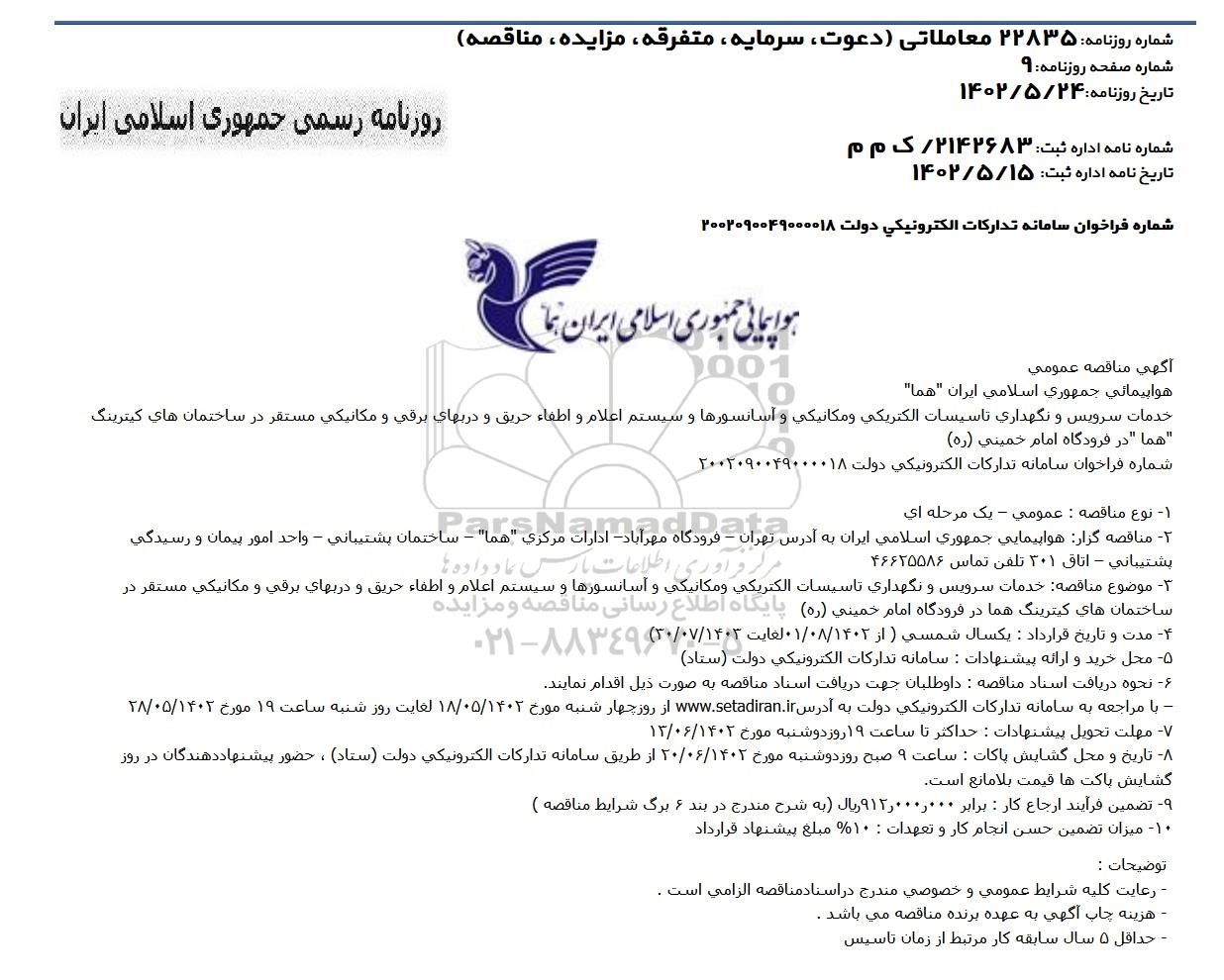 سرویس و نگهداری تاسیسات الکتریکی و مکانیکی و آسانسورها و سیستم اعلام و اطفای حریق و دربهای برقی و مکانیکی مستقر در ساختمان های کیترینگ هما در فرودگاه امام خمینی