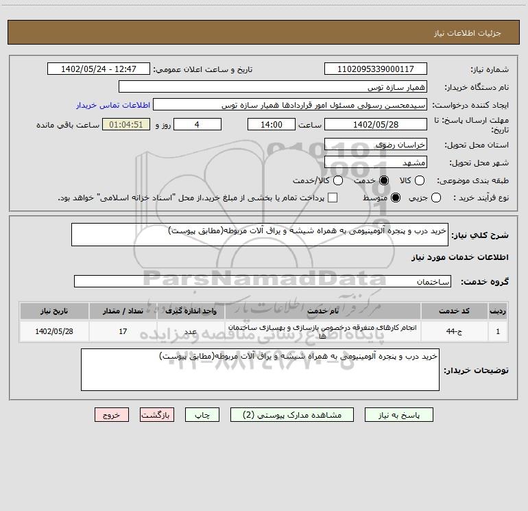 توضیحات خریدار:خرید درب و پنجره آلومینیومی به همراه شیشه و یراق آلات مربوطه(مطابق پیوست)