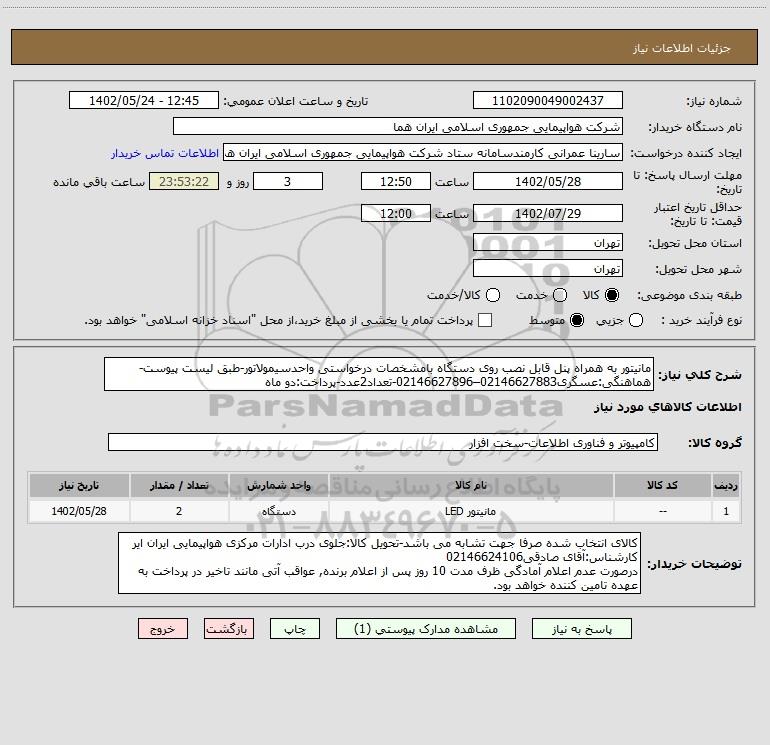 شرح کلی نیاز: مانیتور به همراه پنل قابل نصب روی دستگاه بامشخصات درخواستی واحدسیمولاتور-طبق لیست پیوست-هماهنگی:عسگری02146627883–02146627896-تعداد2عدد-پرداخت:دو ماه