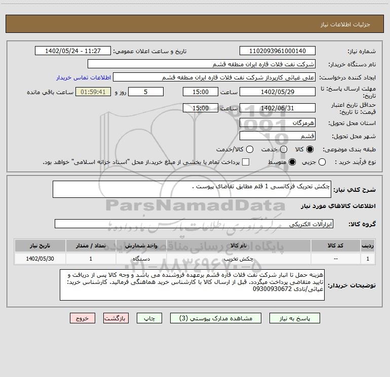 توضیحات خریدار:هزینه حمل تا انبار شرکت نفت فلات قاره قشم برعهده فروشنده می باشد و وجه کالا پس از دریافت و تایید متقاضی پرداخت میگردد. قبل از ارسال کالا با کارشناس خرید هماهنگی فرمائید. کارشناس خرید: غیاثی/نادی 09300930672