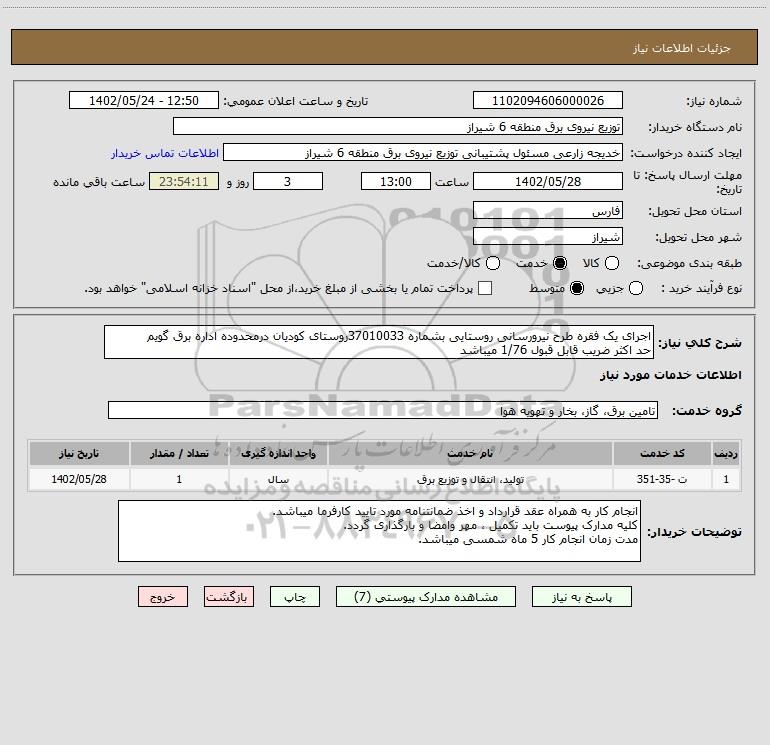 شرح کلی نیاز: اجرای یک فقره طرح نیرورسانی روستایی بشماره 37010033روستای کودیان درمحدوده اداره برق گویم حد اکثر ضریب قابل قبول 1/76 میباشد