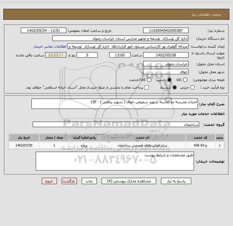 شرح کلی نیاز: احداث مدرسه دو کلاسه شهید سمیعی خواف ( شهید پناهی ) - LSF