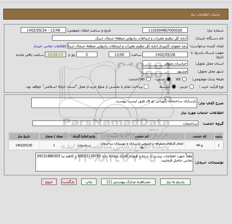 استعلام بازسازی ساختمان نگهبانی اچ اف طبق لیست پیوست, استعلام بازسازی ساختمان نگهبانی اچ اف طبق لیست پیوست