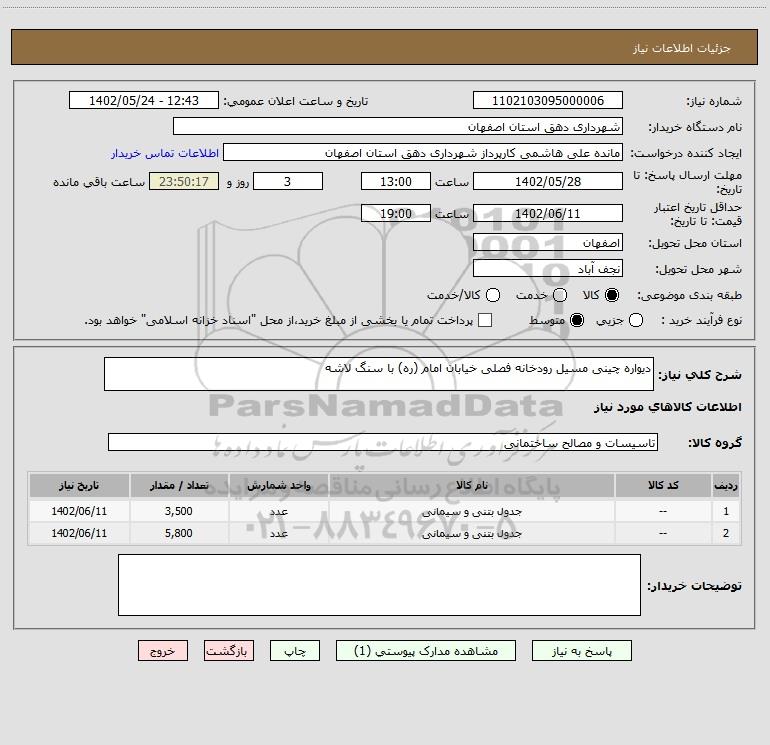 شرح کلی نیاز: دیواره چینی مسیل رودخانه فصلی خیابان امام (ره) با سنگ لاشه