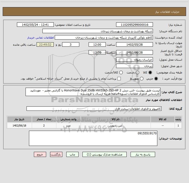 شرح کلی نیاز: لیست طبق پیوست -انتن دیش HonorWave Dual 35dBi HW5565-35D-HP 2 با گارانتی معتبر - موردتایید کارشناس فناوری اطلاعات-تسویه4ماهه-هزینه ارسال با فروشنده-