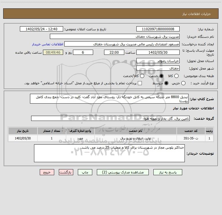 شرح کلی نیاز: تبدیل 8800 متر شبکه سیمی به کابل خودنگه دار- روستای محمد آباد گفت- کلید در دست- جمع بندی کامل روستا