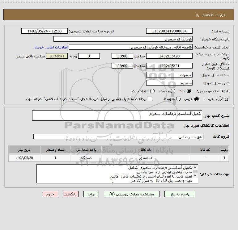 شرح کلی نیاز: تکمیل آسانسور فرمانداری سمیرم